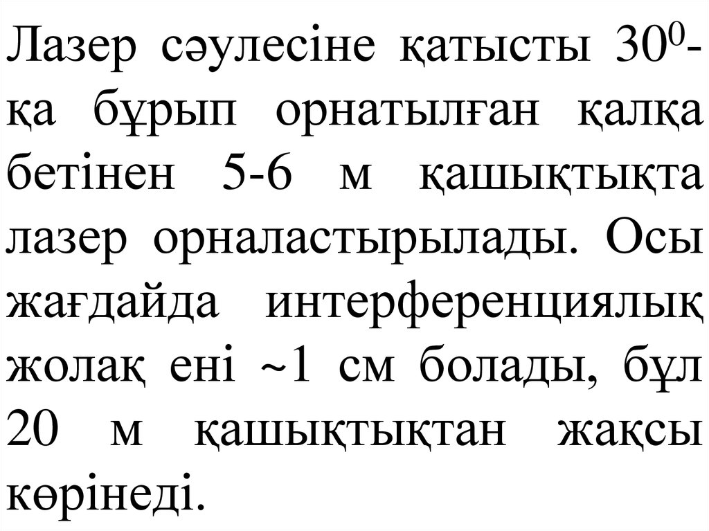 14. Бұл үшін толқын ұзындығы 632 нм жарық шығаратын лазері қолданылады. Қарайтылған фотопластинка бетіне жақын орналасқан екі