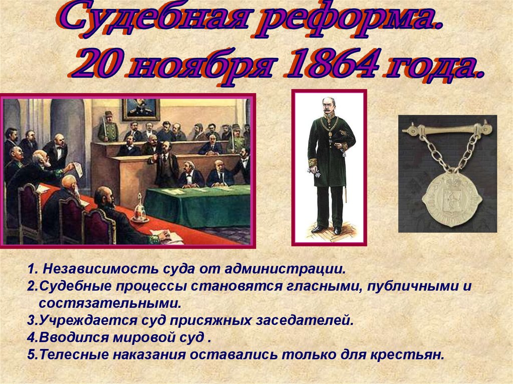 1. Независимость суда от администрации.2.Судебные процессы становятся гласными, публичными и
