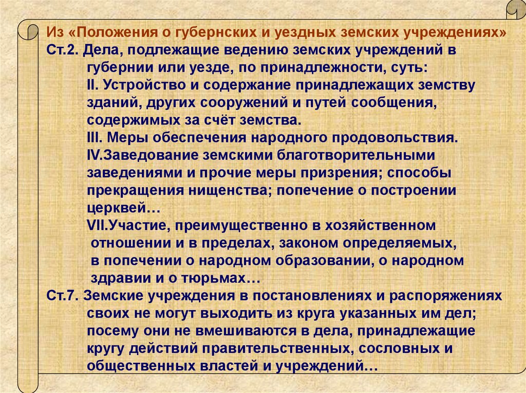 Из «Положения о губернских и уездных земских учреждениях»Ст.2. Дела, подлежащие ведению земских учреждений в