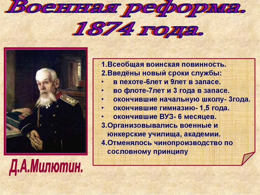1.Всеобщая воинская повинность.2.Введёны новый сроки службы: