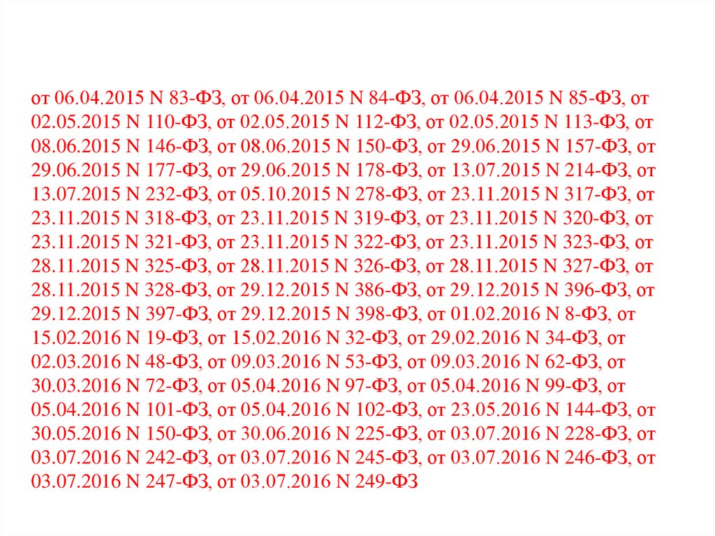 от 06.04.2015 N 83-ФЗ, от 06.04.2015 N 84-ФЗ, от 06.04.2015 N 85-ФЗ, от02.05.2015 N 110-ФЗ, от 02.05.2015 N 112-ФЗ, от 02.05.2015 N 113-ФЗ, от