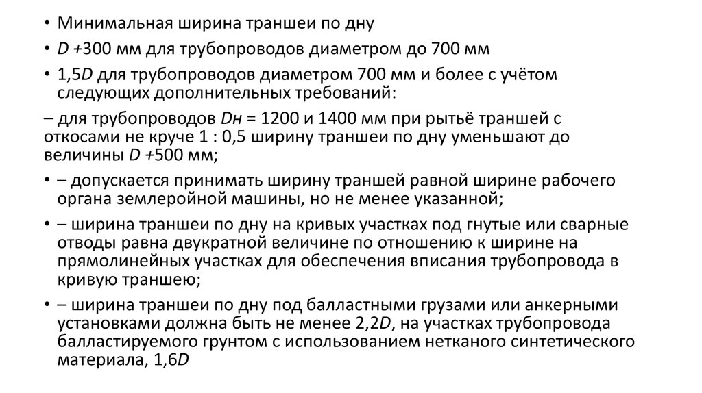 • Минимальная ширина траншеи по дну• D +300 мм для трубопроводов диаметром до 700 мм