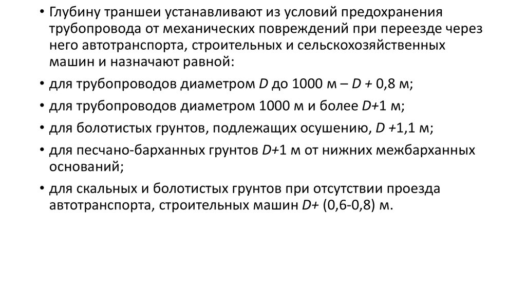 • Глубину траншеи устанавливают из условий предохранениятрубопровода от механических повреждений при переезде через