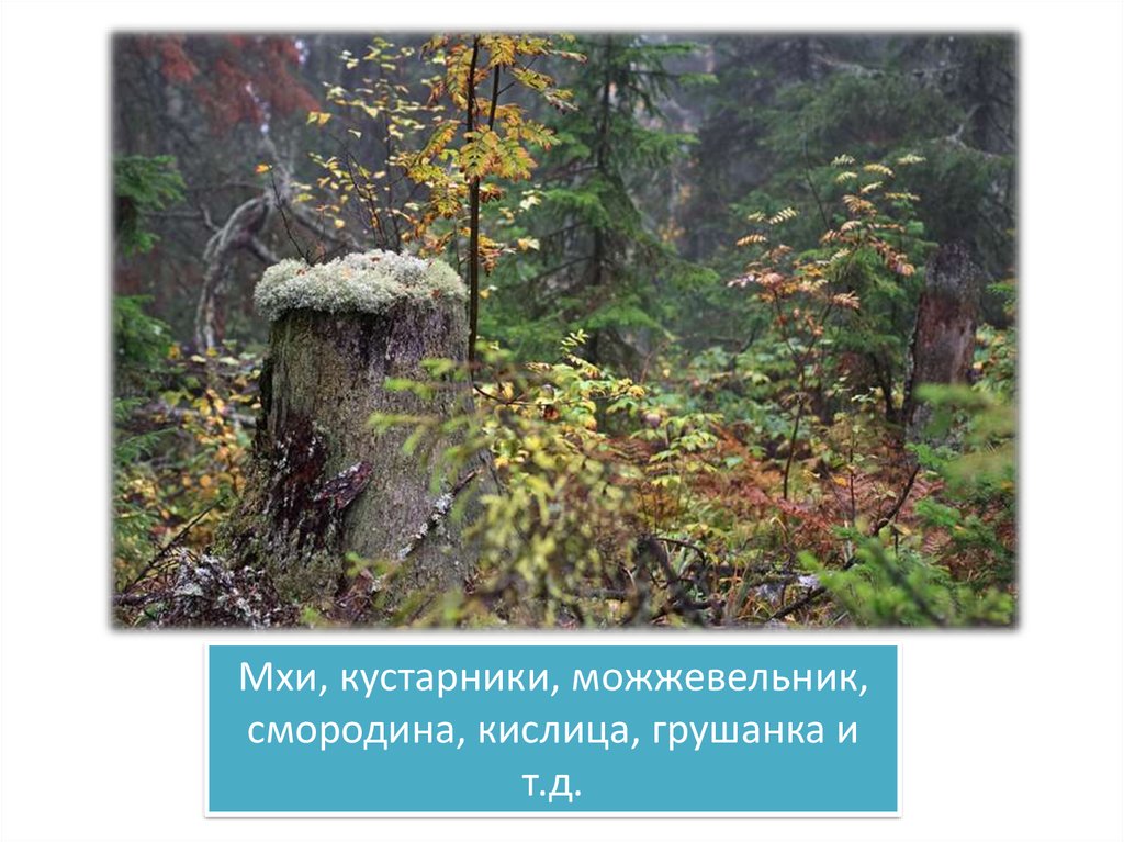 Мхи, кустарники, можжевельник,смородина, кислица, грушанка и
