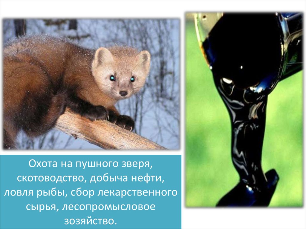 Охота на пушного зверя,скотоводство, добыча нефти,