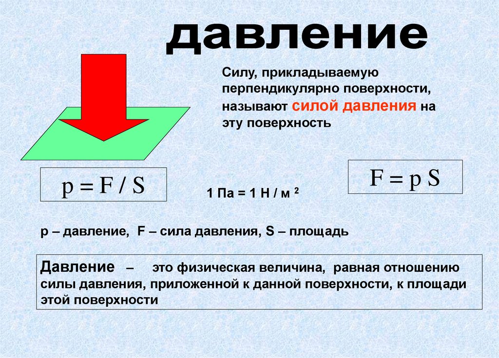 • Давление- физическая величина, численно равнаяотношению силы, действующей перпендикулярно