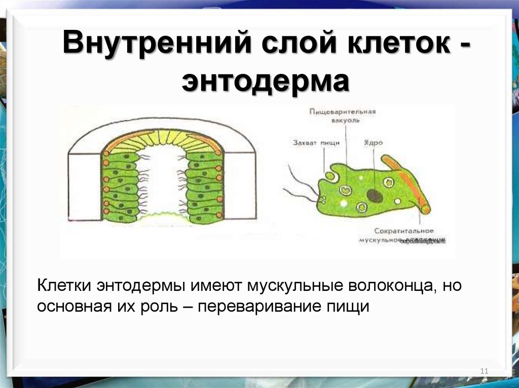 Внутренний слой клеток энтодермаКлетки энтодермы имеют мускульные волоконца, но