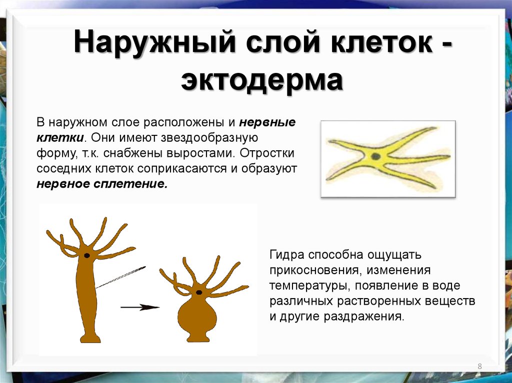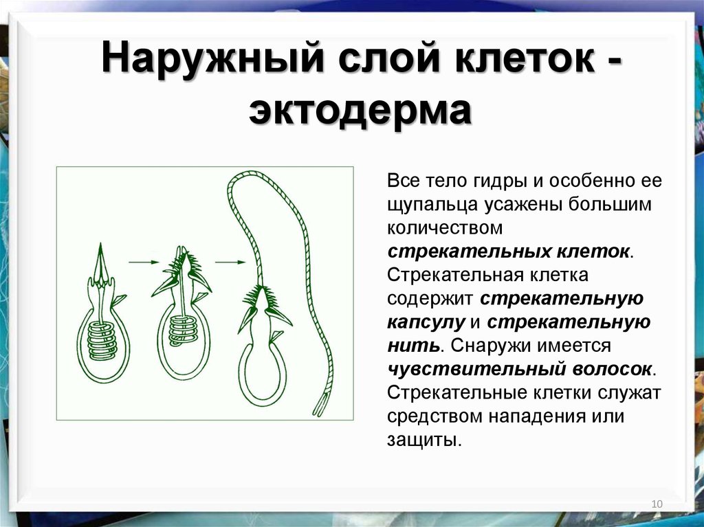 Наружный слой клеток эктодермаВсе тело гидры и особенно ее
