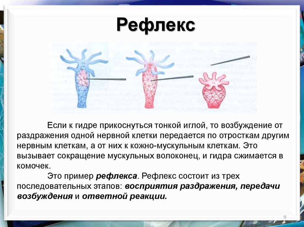 РефлексЕсли к гидре прикоснуться тонкой иглой, то возбуждение от