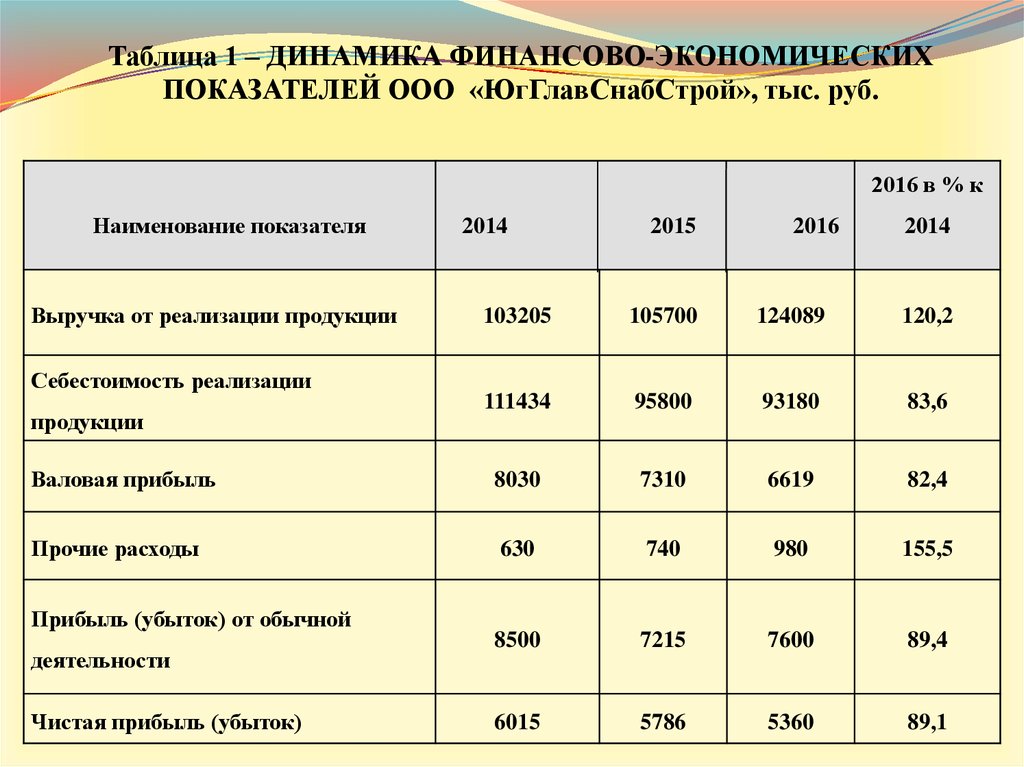 Таблица 1 – ДИНАМИКА ФИНАНСОВО-ЭКОНОМИЧЕСКИХПОКАЗАТЕЛЕЙ ООО «ЮгГлавСнабСтрой», тыс. руб.