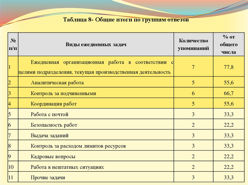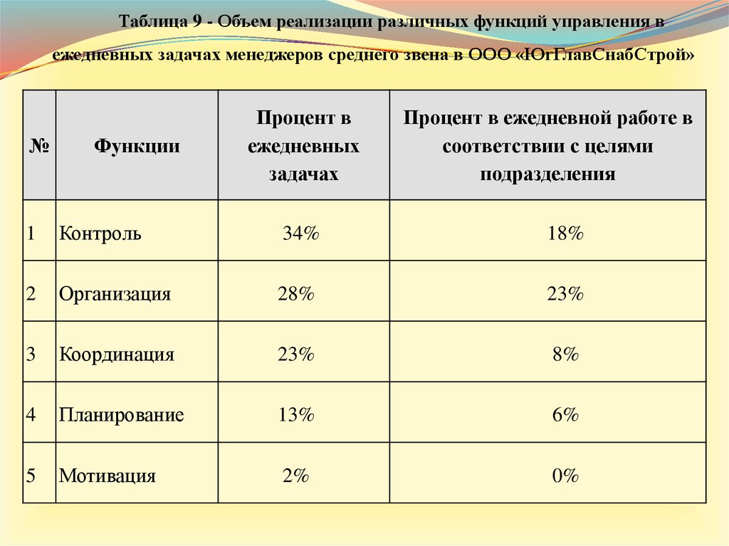Таблица 9 - Объем реализации различных функций управления вежедневных задачах менеджеров среднего звена в ООО «ЮгГлавСнабСтрой»