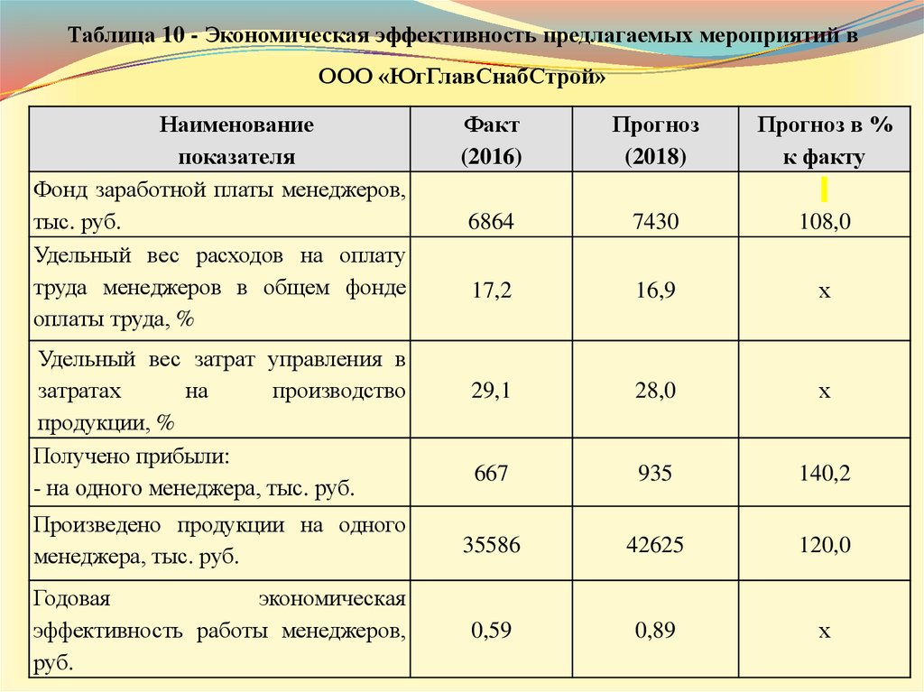 Таблица 10 - Экономическая эффективность предлагаемых мероприятий вООО «ЮгГлавСнабСтрой»
