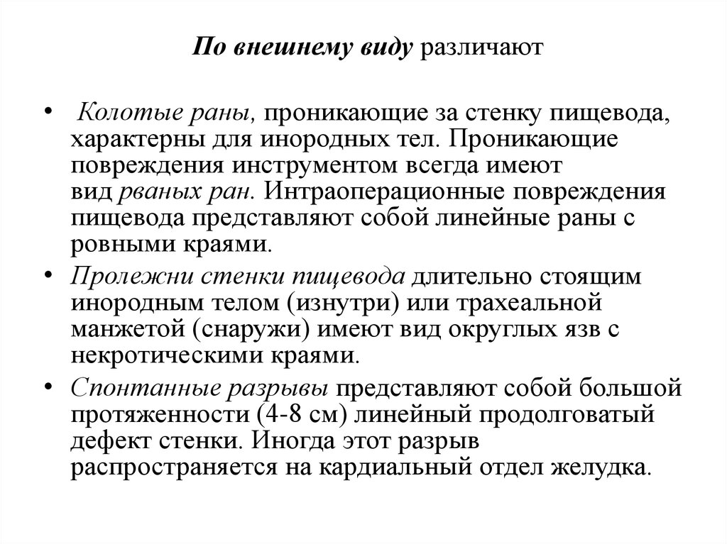 По внешнему виду различают• Колотые раны, проникающие за стенку пищевода,