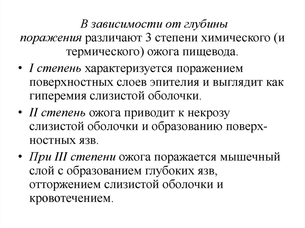 В зависимости от глубиныпоражения различают 3 степени химического (и