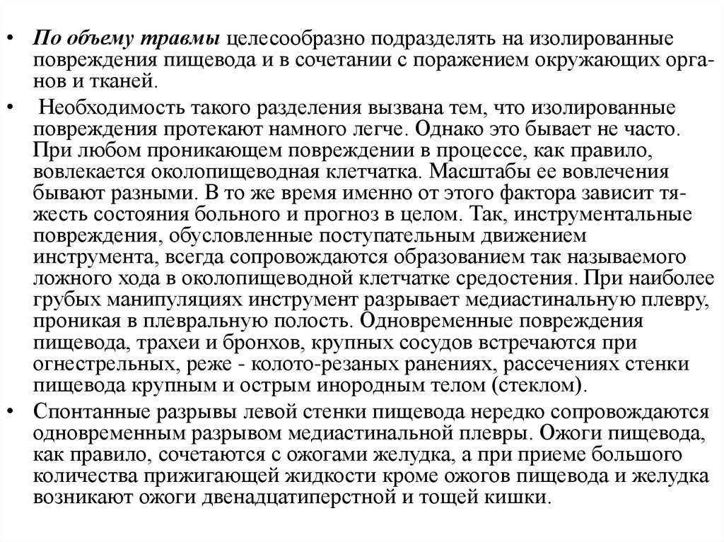 • По объему травмы целесообразно подразделять на изолированныеповреждения пищевода и в сочетании с поражением окружающих органов и тканей.