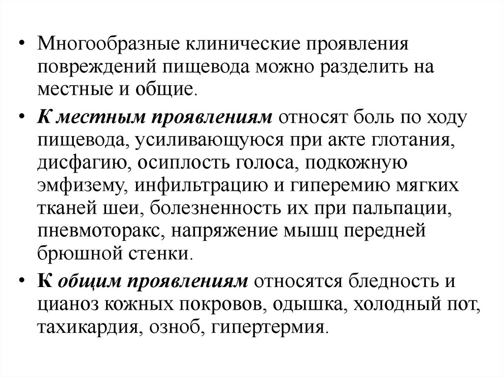 • Многообразные клинические проявленияповреждений пищевода можно разделить на