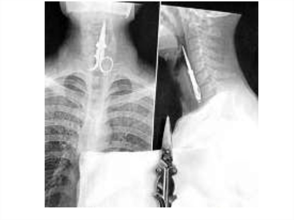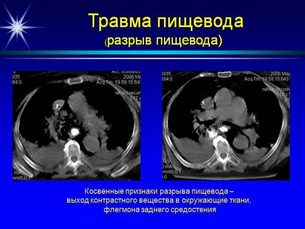 • Среди рентгенологических признаковповреждений пищевода следует различать