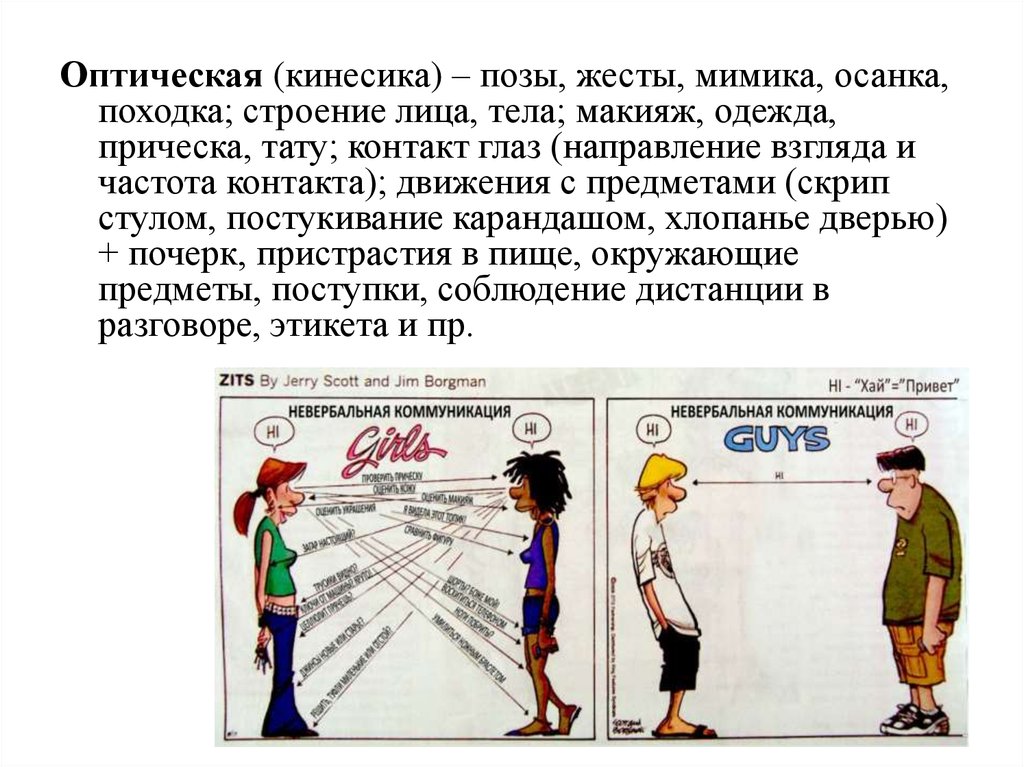 Оптическая (кинесика) – позы, жесты, мимика, осанка,походка; строение лица, тела; макияж, одежда,