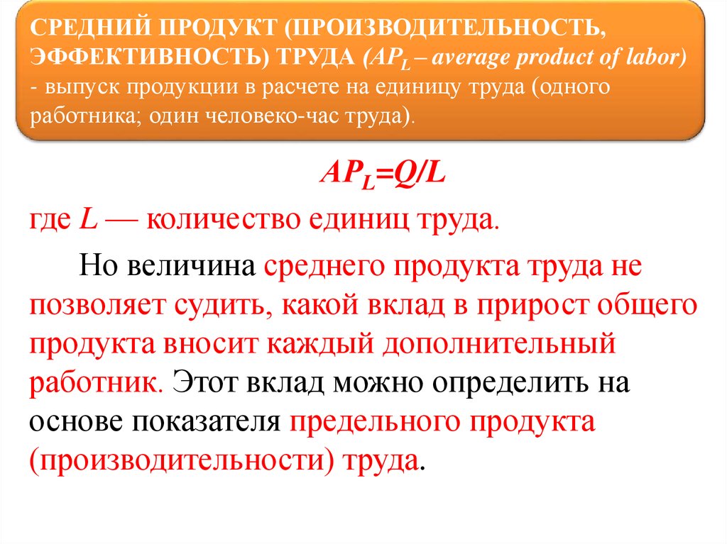 СРЕДНИЙ ПРОДУКТ (ПРОИЗВОДИТЕЛЬНОСТЬ,ЭФФЕКТИВНОСТЬ) ТРУДА (АРL – average product of labor)
