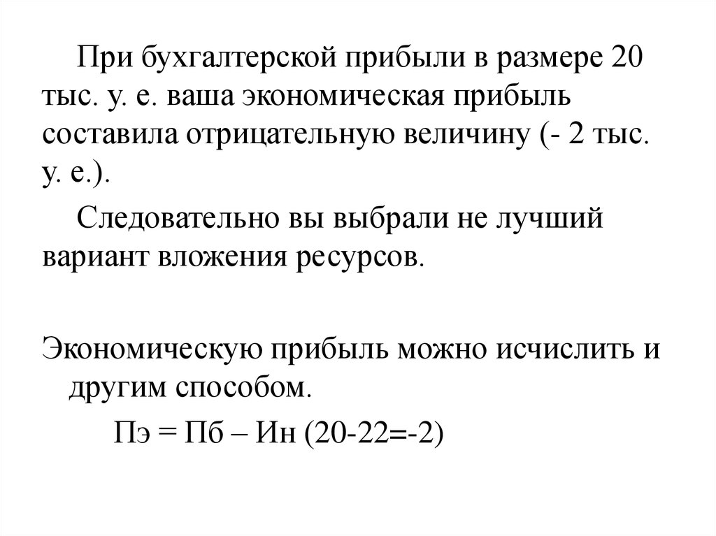 При бухгалтерской прибыли в размере 20тыс. у. е. ваша экономическая прибыль