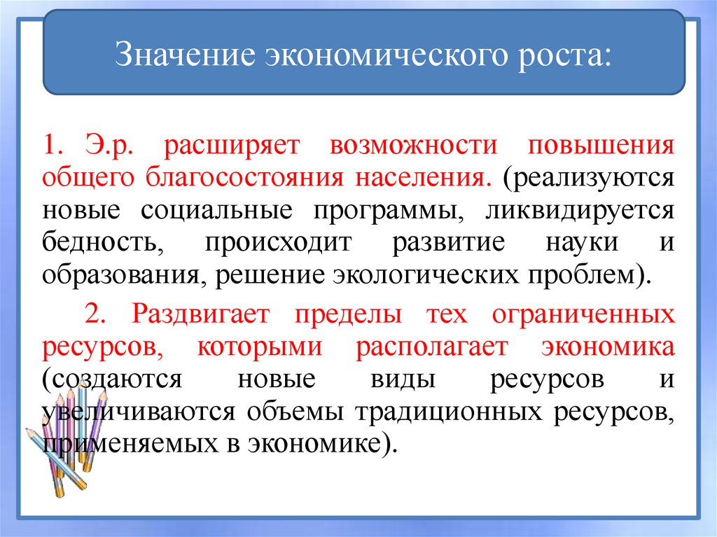 Значение экономического роста:1. Э.р. расширяет возможности повышения