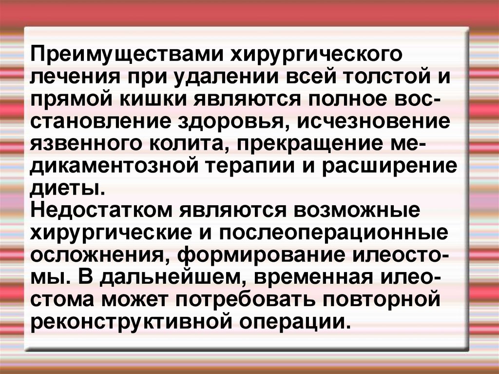 Преимуществами хирургическоголечения при удалении всей толстой и