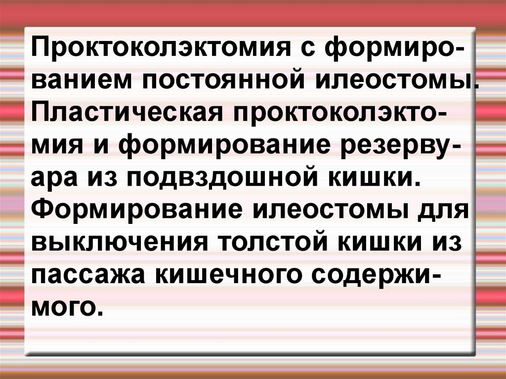 Проктоколэктомия с формированием постоянной илеостомы.Пластическая проктоколэктомия и формирование резервуара из подвздошной кишки.