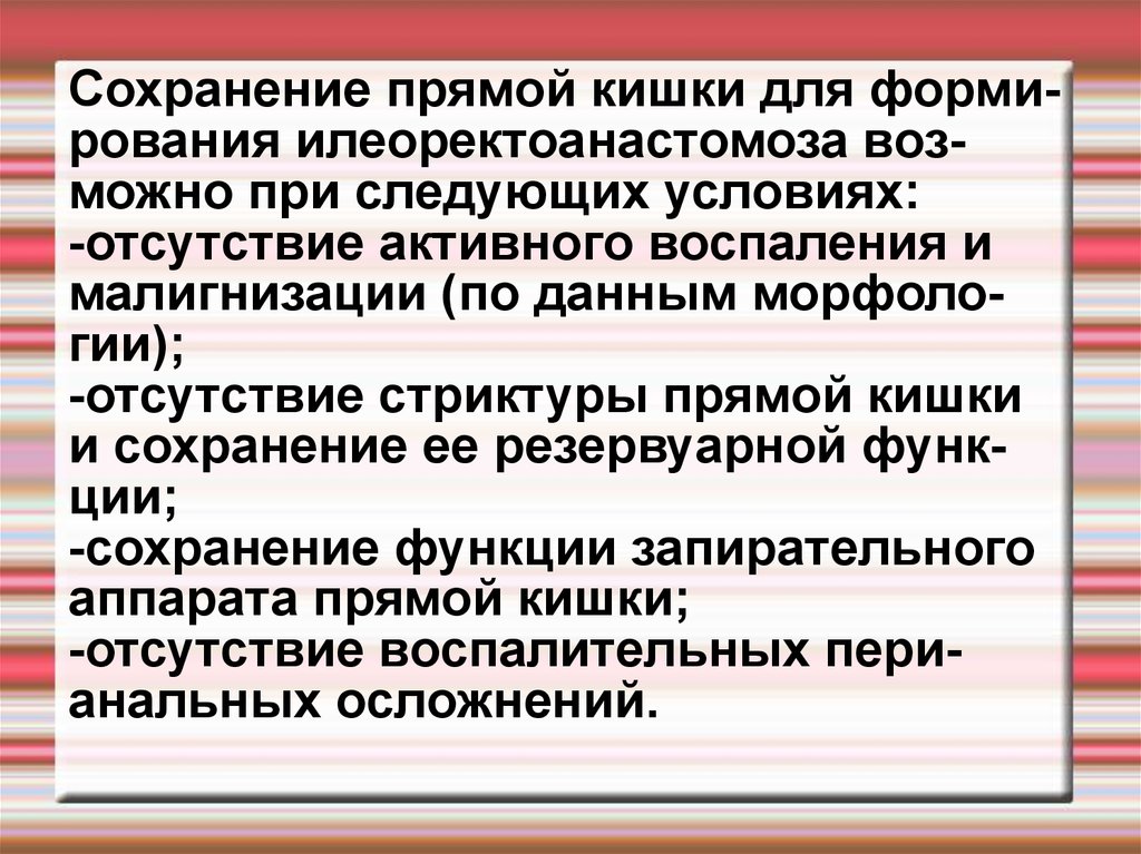 Сохранение прямой кишки для формирования илеоректоанастомоза возможно при следующих условиях:-отсутствие активного воспаления и