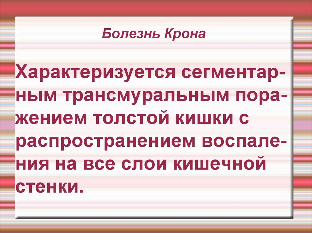 Болезнь КронаХарактеризуется сегментарным трансмуральным поражением толстой кишки с