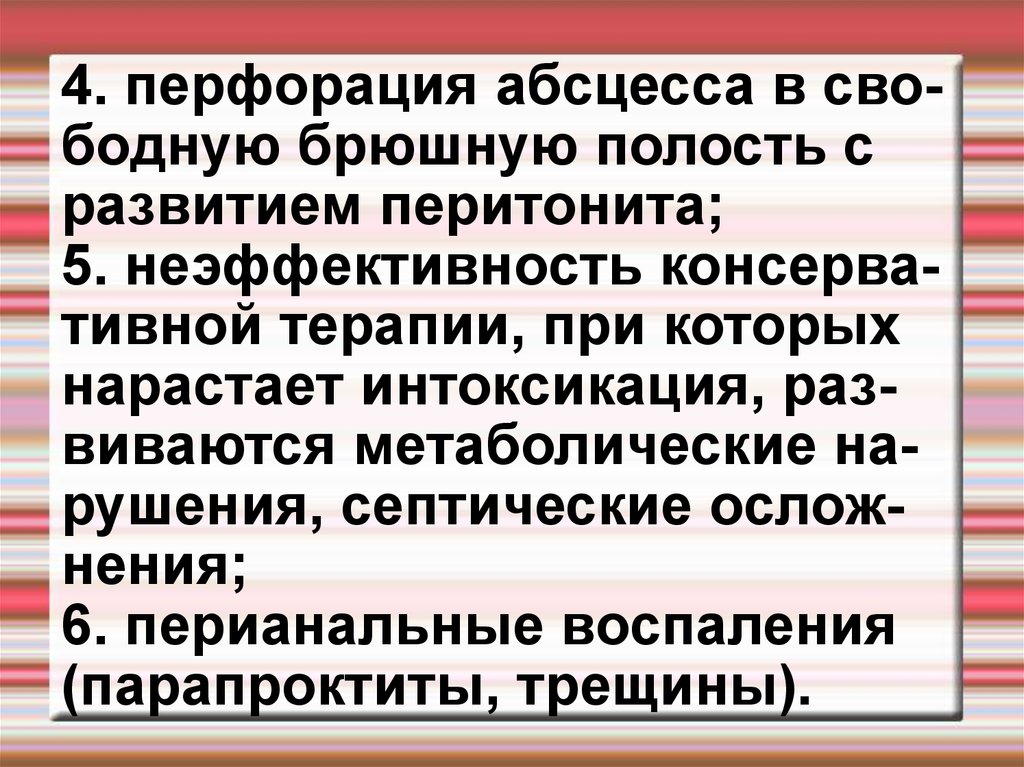 4. перфорация абсцесса в свободную брюшную полость сразвитием перитонита;