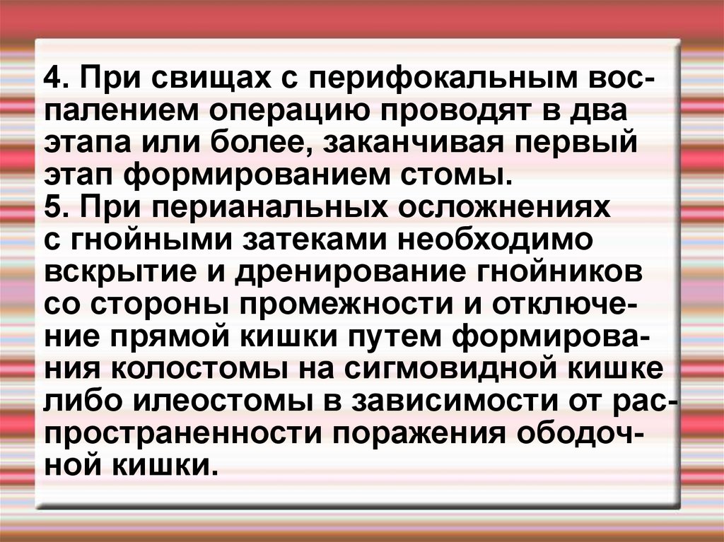 4. При свищах с перифокальным воспалением операцию проводят в дваэтапа или более, заканчивая первый