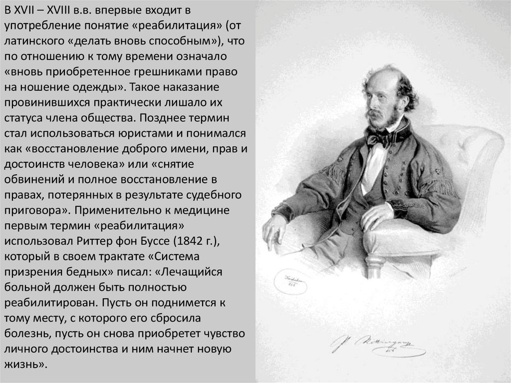 В XVII – XVIII в.в. впервые входит вупотребление понятие «реабилитация» (от