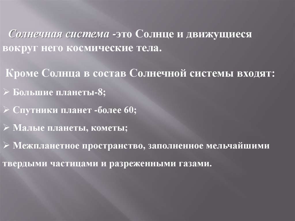 Солнечная система -это Солнце и движущиесявокруг него космические тела.