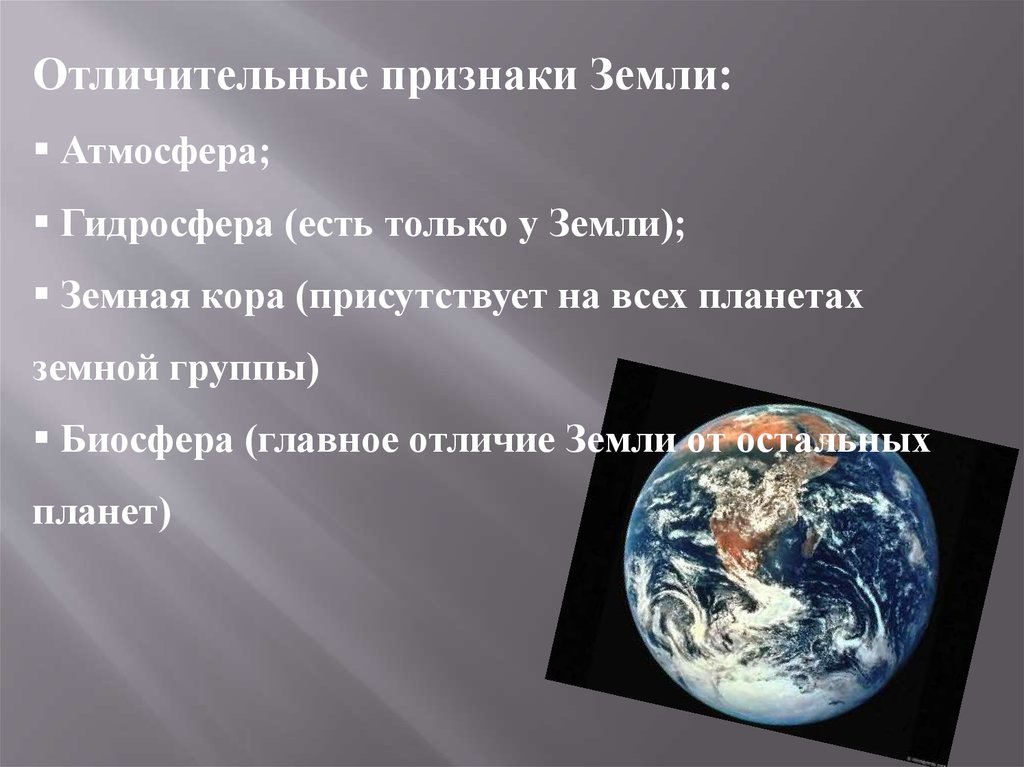 Отличительные признаки Земли:Атмосфера;