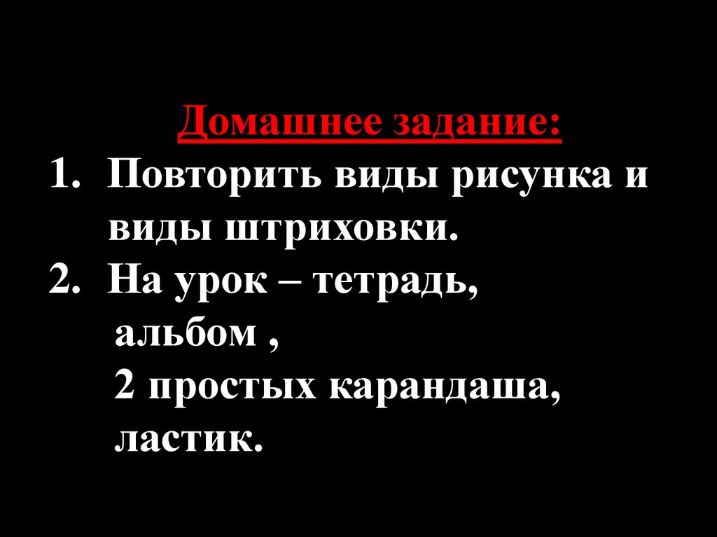 Домашнее задание:1. Повторить виды рисунка и