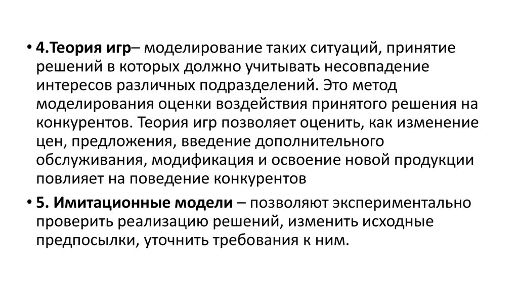 • 4.Теория игр– моделирование таких ситуаций, принятиерешений в которых должно учитывать несовпадение