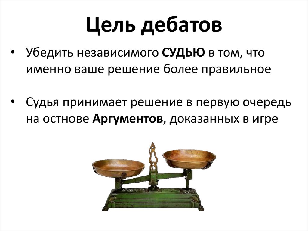Цель дебатов• Убедить независимого СУДЬЮ в том, что