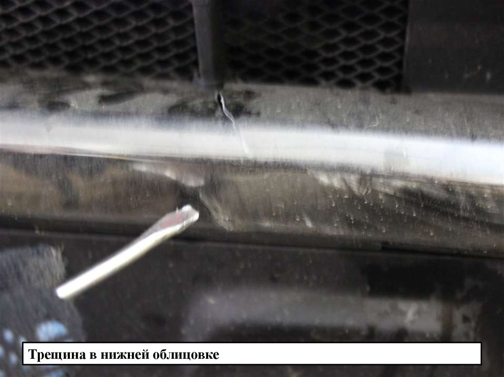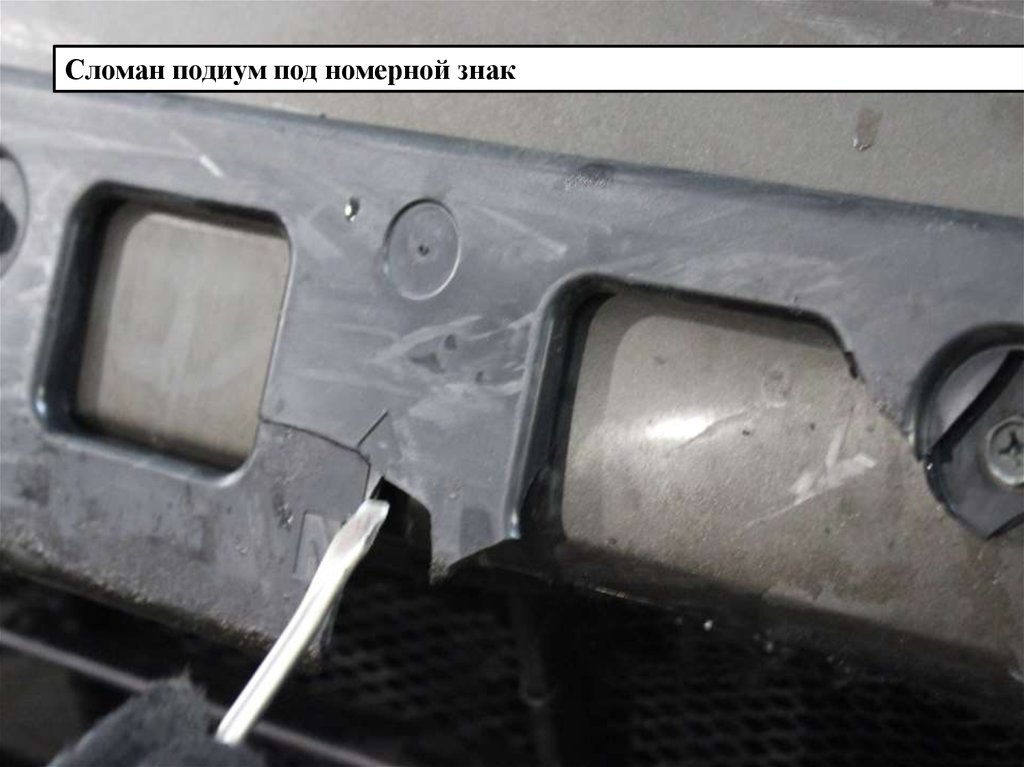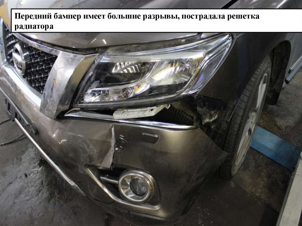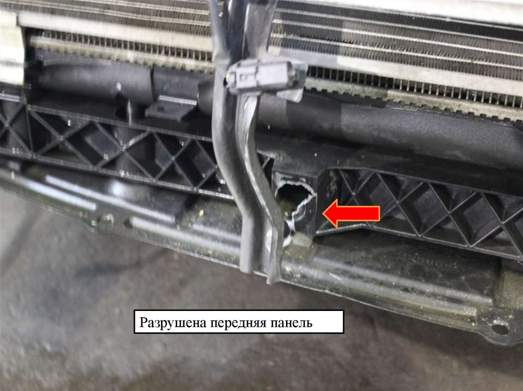 Передний бампер имеет большие разрывы, пострадала решеткарадиатора