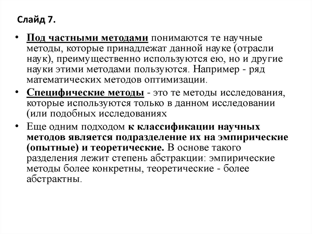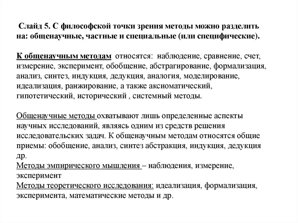 Слайд 5. С философской точки зрения методы можно разделитьна: общенаучные, частные и специальные (или специфические).