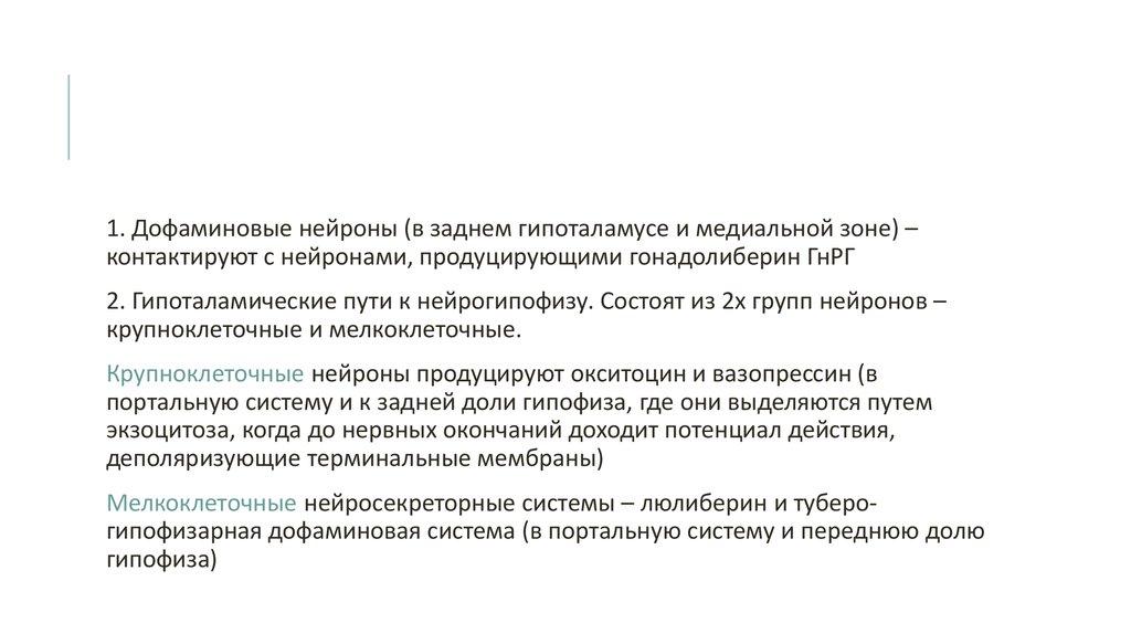 1. Дофаминовые нейроны (в заднем гипоталамусе и медиальной зоне) –контактируют с нейронами, продуцирующими гонадолиберин ГнРГ