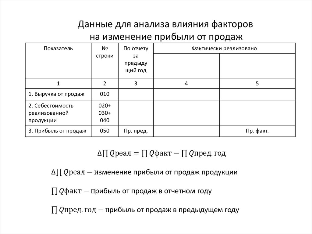 Данные для анализа влияния факторовна изменение прибыли от продаж