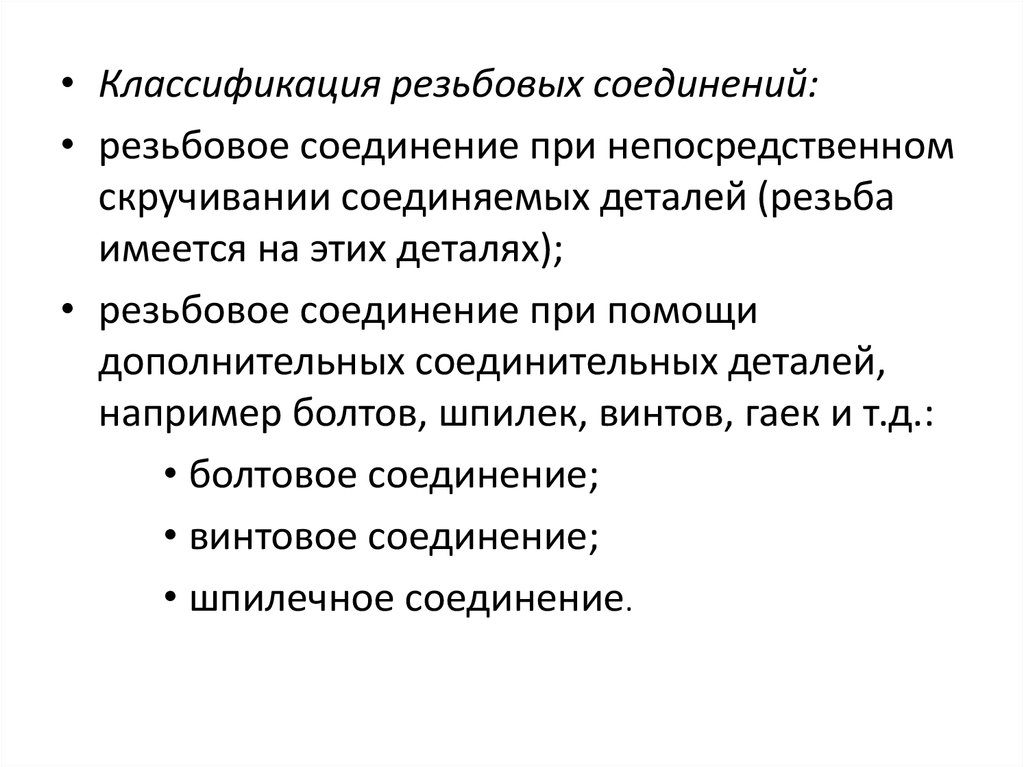 • Классификация резьбовых соединений:• резьбовое соединение при непосредственном