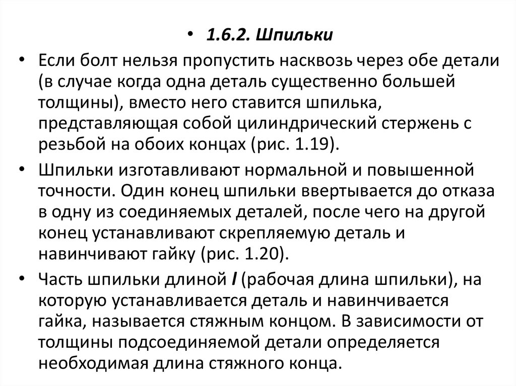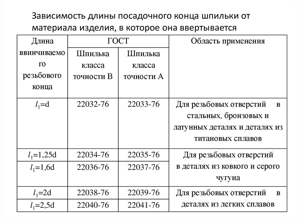 Зависимость длины посадочного конца шпильки отматериала изделия, в которое она ввертывается