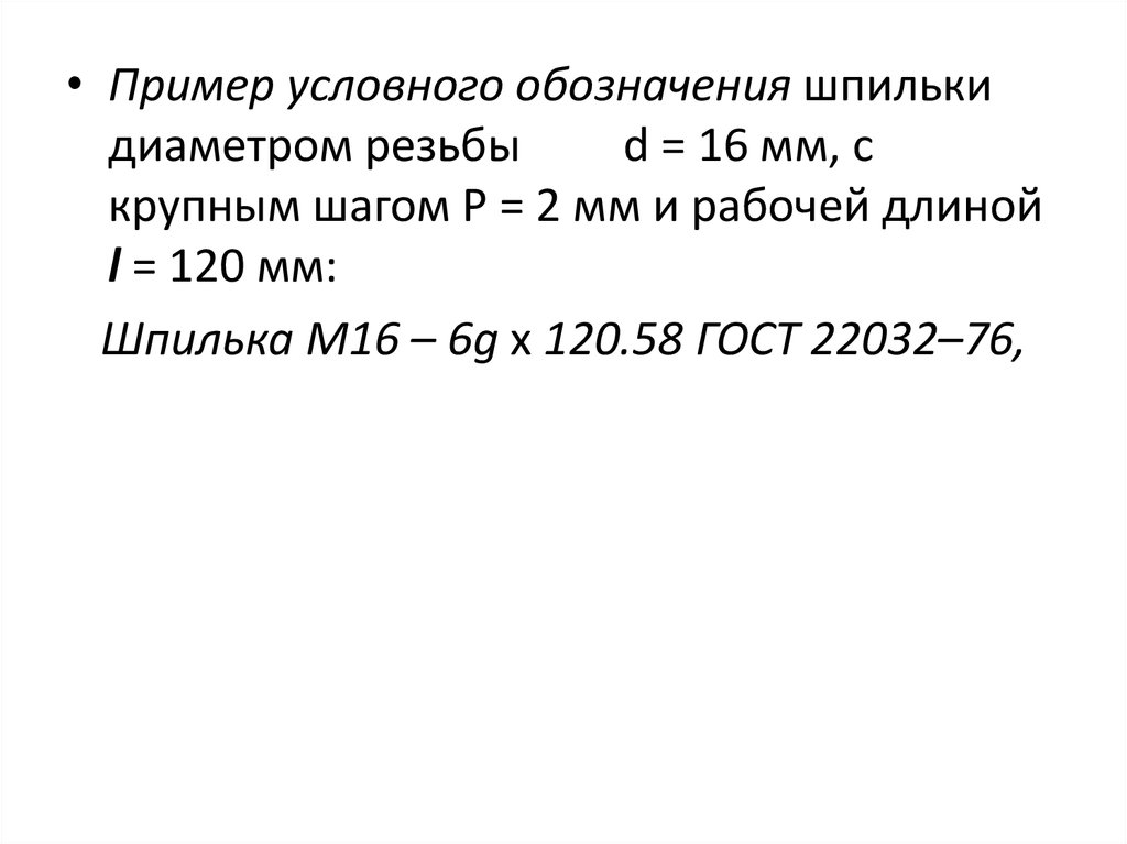 • Пример условного обозначения шпилькидиаметром резьбы