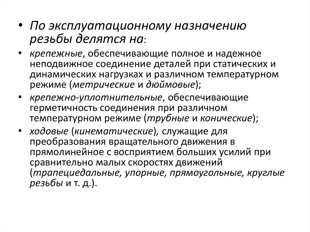 • По эксплуатационному назначениюрезьбы делятся на: