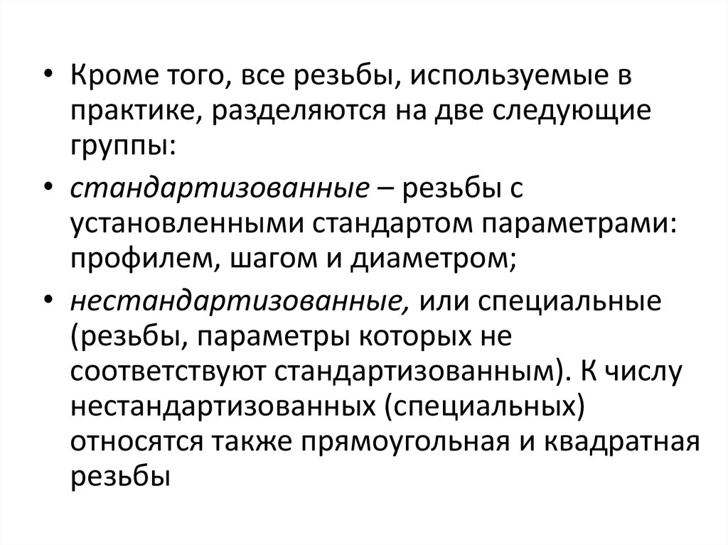 • Кроме того, все резьбы, используемые впрактике, разделяются на две следующие