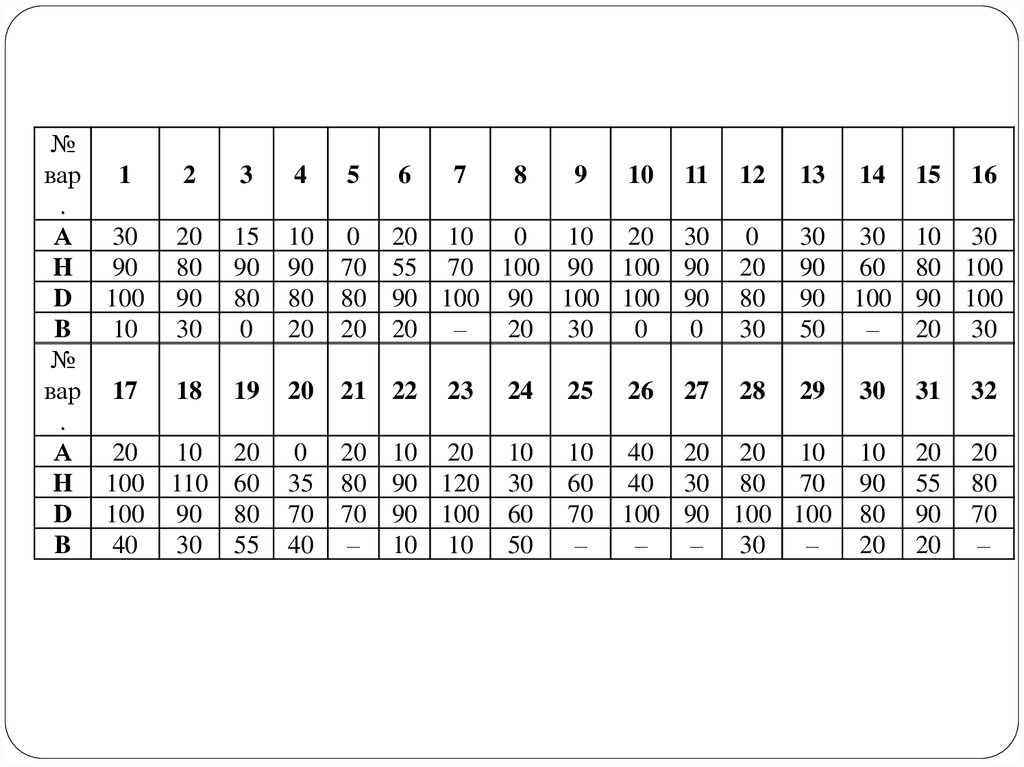 Варианты 1, 2, 8, 9, 15, 16, 22, 28Варианты 3, 4, 10, 11, 17, 18, 23, 30