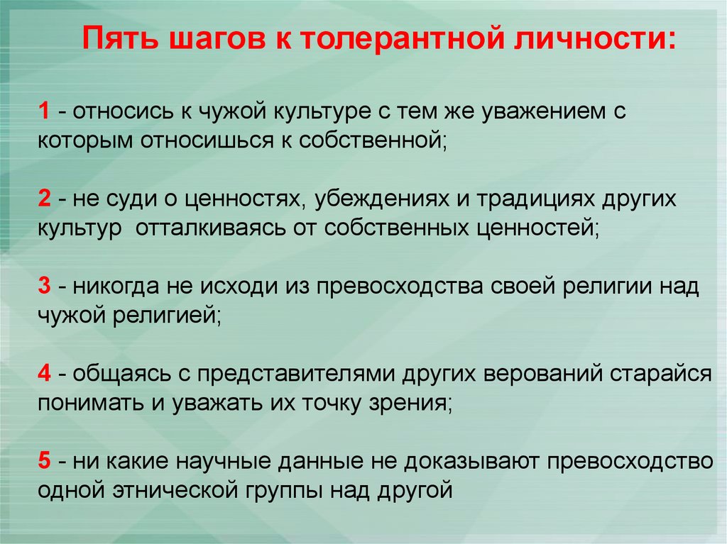 Пять шагов к толерантной личности:1 - относись к чужой культуре с тем же уважением с