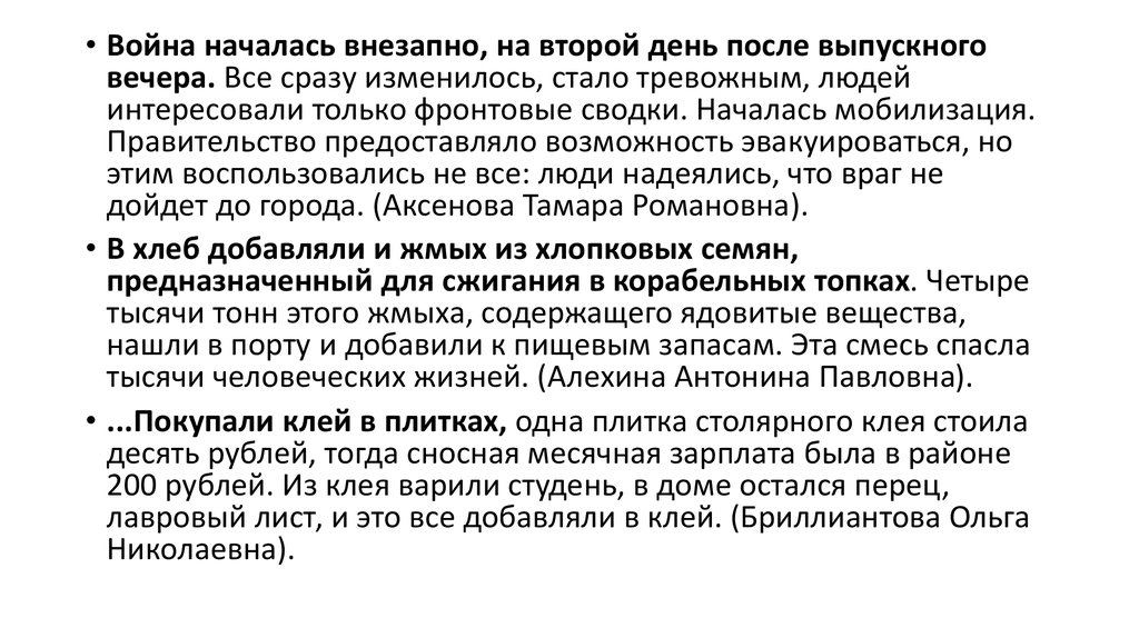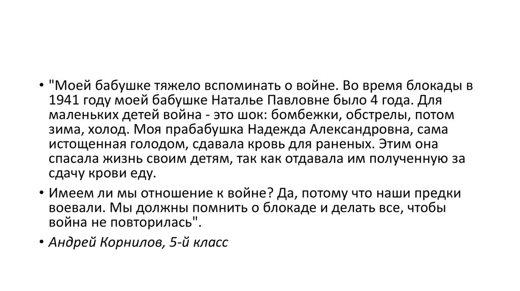• "Моей бабушке тяжело вспоминать о войне. Во время блокады в1941 году моей бабушке Наталье Павловне было 4 года. Для