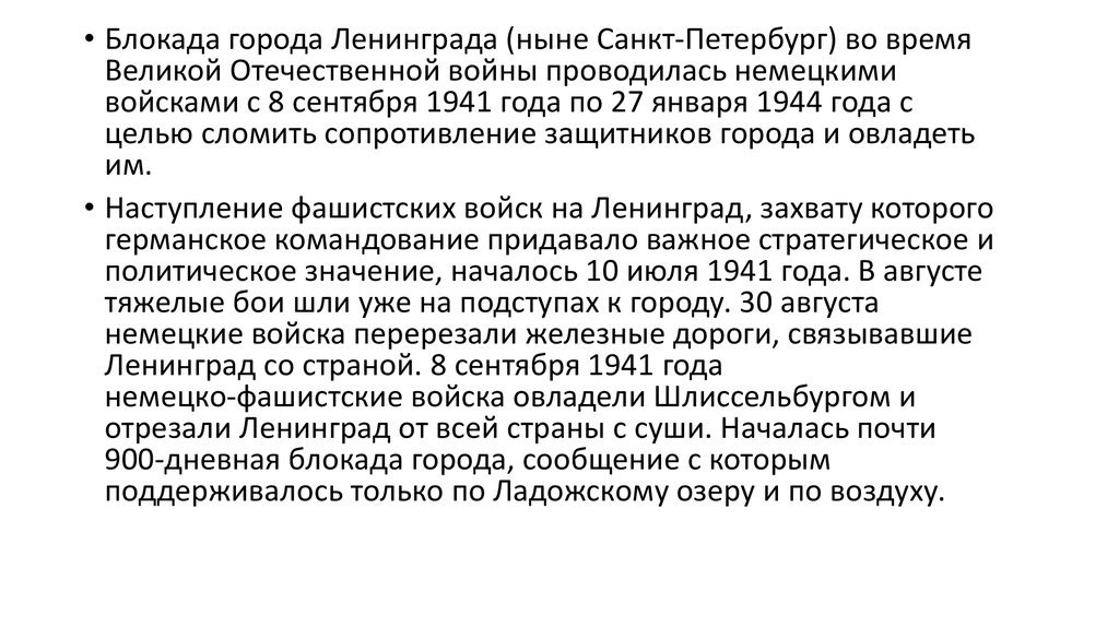 • Блокада города Ленинграда (ныне Санкт-Петербург) во времяВеликой Отечественной войны проводилась немецкими